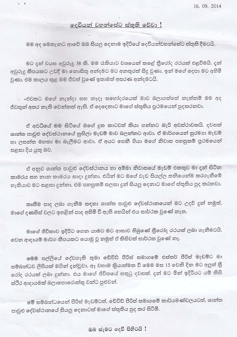 We are so thankful to Ms Esther Pieris of Ms David Pieris Motor